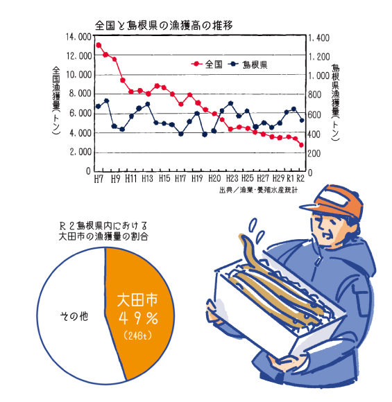 そのうち県内水揚げ量の約半分が大田市で占められており、大田市は名実ともに、日本有数のアナゴの一大水揚げ拠点となっています。