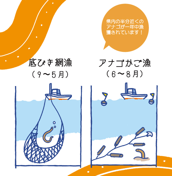 6月から8月は「アナゴかご漁」、9月から5月は「底引網漁」により、一年中漁獲されています。大田市内の底引き網漁は、日帰り(一日漁)で行われており、鮮度バツグンです!