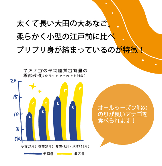 夏から秋にかけて脂の乗りが良いことが分かっており、「大田の大あなご」は長期間に渡り、その美味しさが続きます。