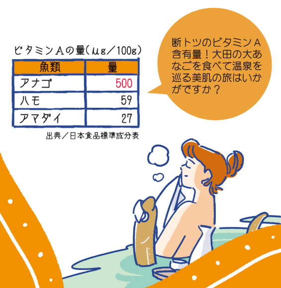 肌を健康に保つ作用や免疫刀向上の効果もあるビタミンAの含有量は、魚類の中でもトップワラスです。